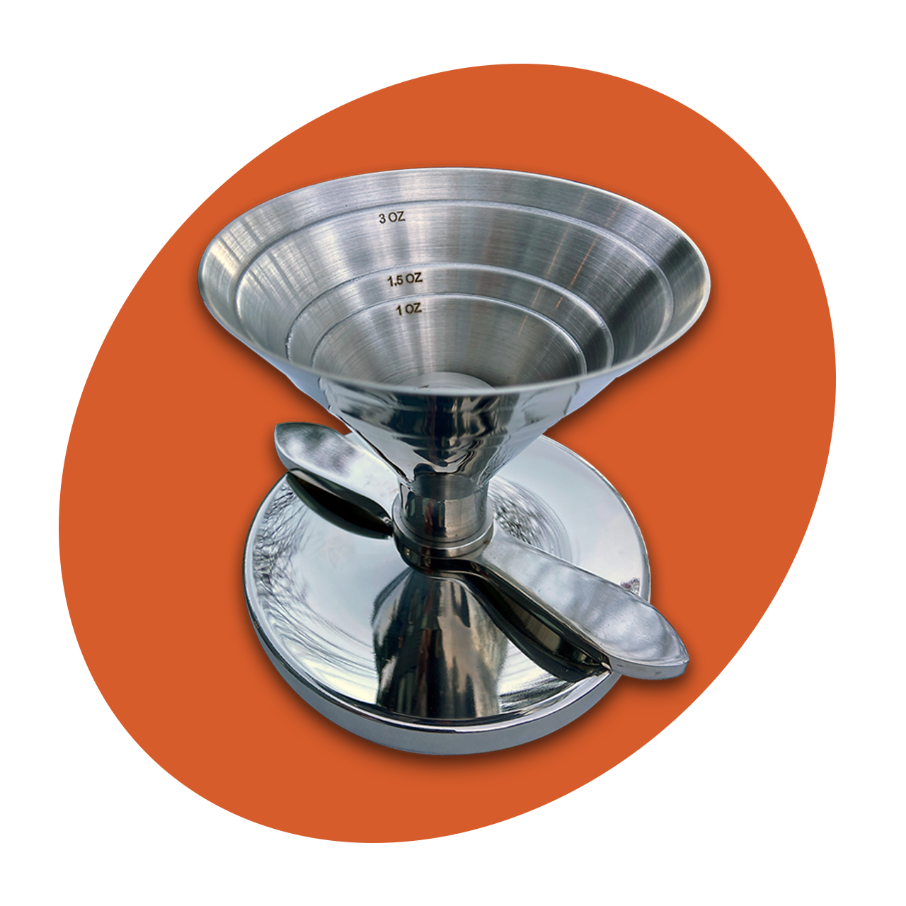 Solo Act: A heavy stainless steel jigger with measured funnel and streamlined pour/push mechanism.  The funnel includes 6 measurement lines for your craft cocktails.  Each jigger comes in a well-designed gift box.