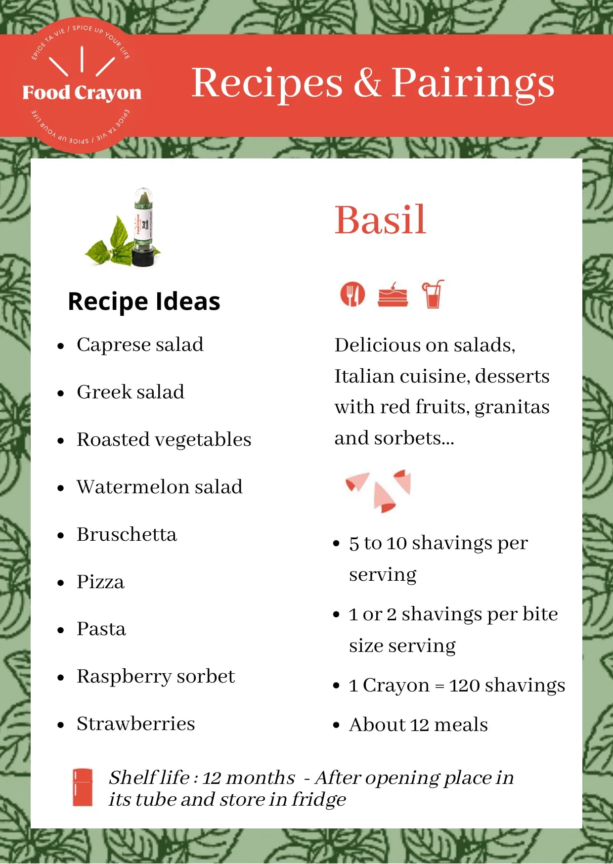 The Basil Crayon works well on Italian dishes such as salads, tomato-mozzarella, pasta, pizza, and bruschetta. It can also be used on desserts with red fruits, granitas, and sorbets.