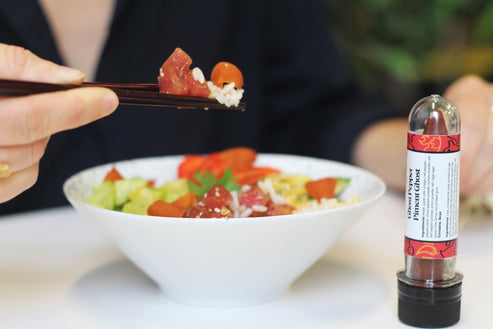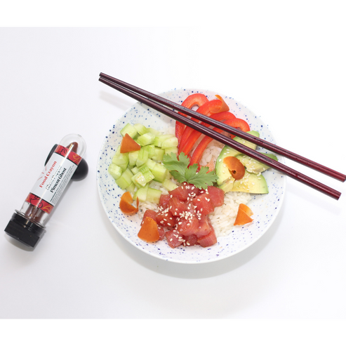 Water, apple cider vinegar, red chili pepper, chili paste, Ghost Pepper powder, tomato juice, red bell pepper powder, onion powder, salt, agar-agar, gluten-free tamari, carob gum.