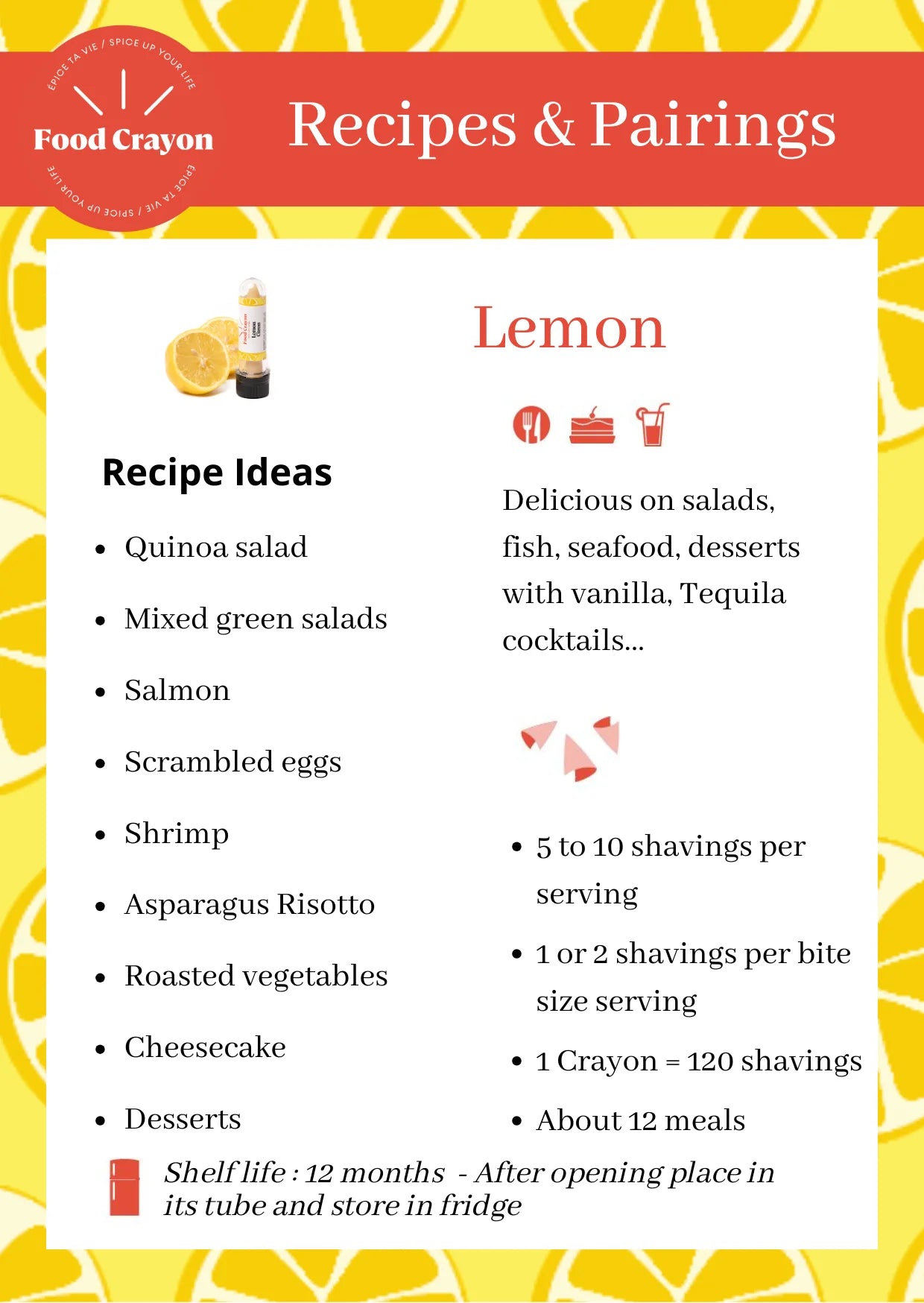 Chicken: Lemon complements the flavors of chicken, whether grilled, roasted, or cooked in a sauce. The Lemon Food Crayon add a tangy and aromatic element to the dish.