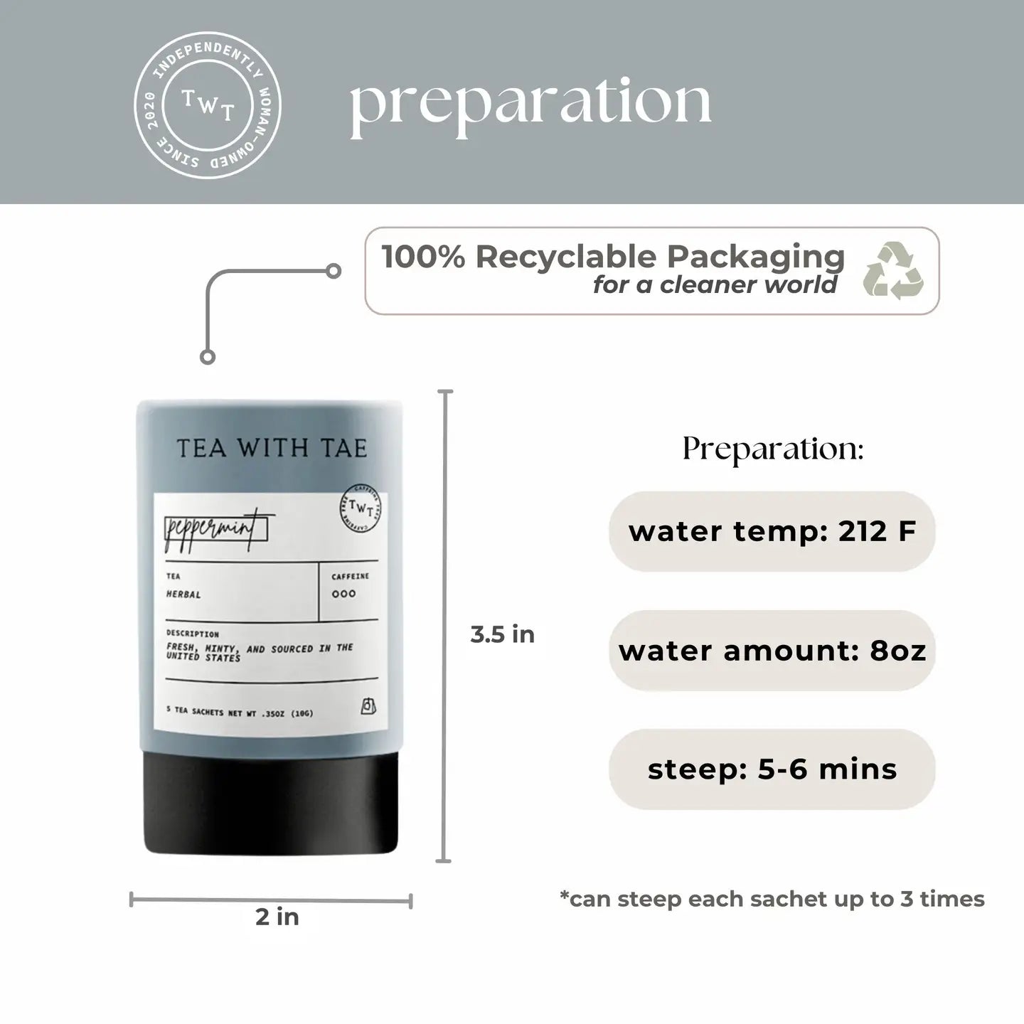 The perfect small gift for any occasion under $10. Each mini tea tube is 2” wide and 3.5” tall and is made from 100% recyclable rigid paper tube material. Inside are 5 pyramid tea bags that are made from premium, plastic-free, biodegradable material. Each tea bag holds approximately 2-2.5 grams of whole-leaf tea and herbs.