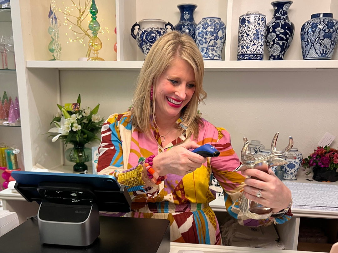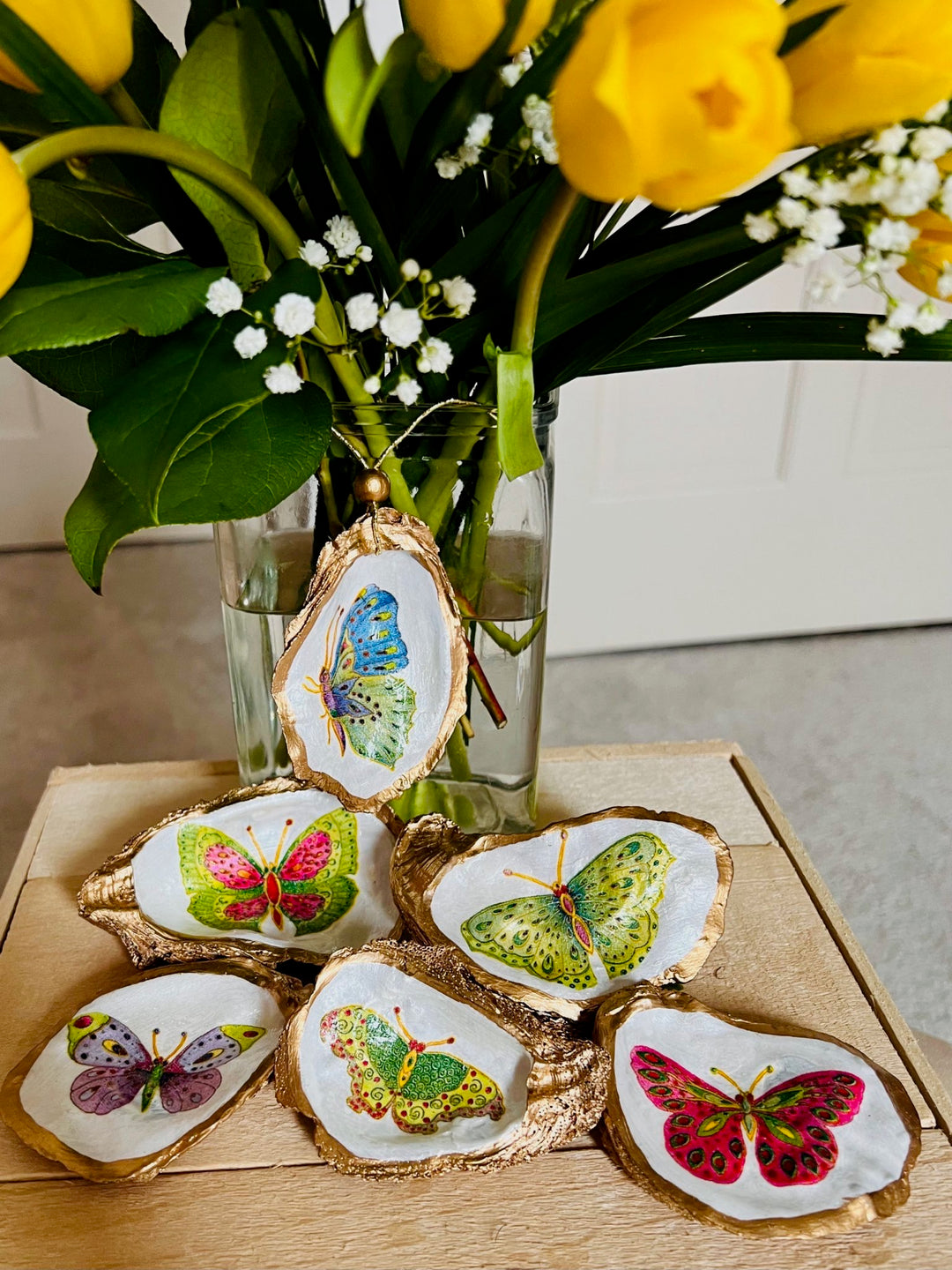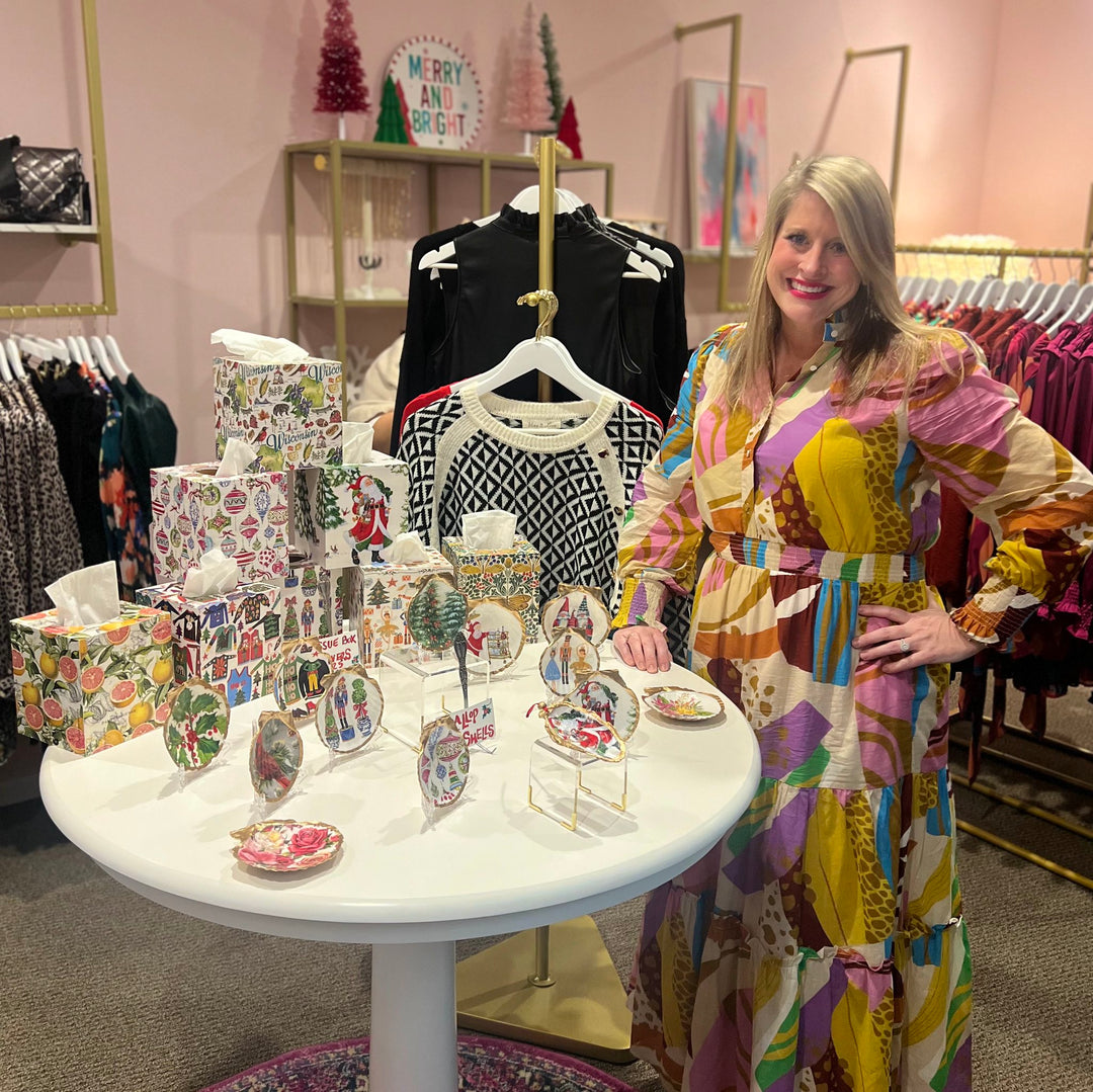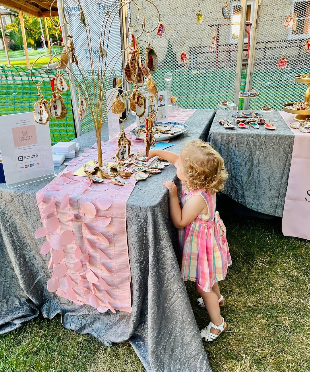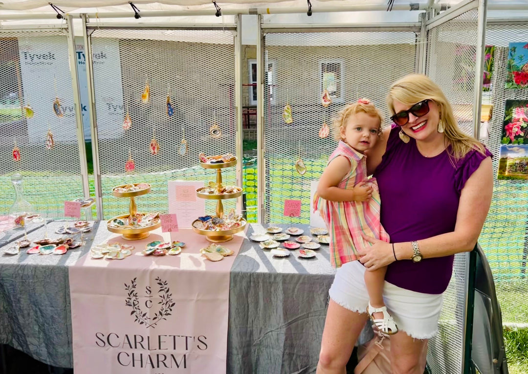 The Scarlett’s Charm story began when I was laid off two weeks before returning from maternity leave in 2020. I saw a Facebook ad for a store in North Carolina selling oyster shells that were decoupaged with beautiful designs and hand painted with gold leaf. They were transformed into unique ring dishes and ornaments and because I am originally from North Carolina, it spoke to me on several levels. I talked about it so much that my husband finally told me to buy the things to make them and try it! The rest is history. I gave them to friends and family and before I knew it, stores downtown were carrying them and from there it took off. When the first store asked me what the business name was, I was trying to twist the words southern charm around with other words, and suddenly I heard my newborn Scarlett make a baby noise and I looked down at her sweet face and knew that it had to be named, Scarlett’s Charm. Now four years later, and after a lot of thought, love, support and prayer, we have a brick and mortar store.